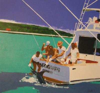 In a recent New York Times review of Robert Cunningham’s paintings from the Carribean, William Zimmer wrote, “…Mr. Cunningham is originally from Kansas, and his native ground has been an inspiration for the flat, bright planes of color that characterize his work. This insistent abstract component is complemented by a sense of local color, proving that he is on close terms with the place.” Zimmer goes on to say that Cunningham shares with Edward Hopper an overwhelming use of light. For almost forty years Bob Cunningham has made his indelible mark on the field of illustration with his unique sense of abstract composition, color and use of light. He has done so with admirable consistency for a client list that is the envy of any illustrator: Sports Illustrated, DuPont, General Electric, Mobil, Alfa Romeo, AT&T, IBM, American Airlines, ABC, Alcoa, Panasonic, Chevrolet, Mead Paper, Metropolitan Opera, and the U.S. Postal Service. Add to this partial list of clients, Gold and Silver Medals from the Society of Illustrators, as well as the Hamilton King Award in 1983. One could say that Bob Cunningham has come a long way from Herington, Kansas. The son of a railroad man, Bob was born into a simple life on the heartland prairie. He has two older brothers and a younger sister. His mother died soon after giving birth to his sister in 1929. By the time Bob reached second grade, he had made the decision to become an artist. At age 12, his family moved to Kansas City, Kansas, where Bob graduated from Wyandotte High School in 1942. He joined the Navy that same year and became an air cadet, finally serving as a radar man in a three-man TBF torpedo bomber. Out of the service in 1945, Bob took advantage of the G.I. Bill and started his studies at the University of Kansas and then went to the Kansas City Art Institute for two years. Bob said recently that had it not been for the G.I. Bill, he may not have had the chance to pursue his artistic dream, proving once again that serendipity plays a pivotal role in each of our lives. In 1949, Bob packed his suitcase and ambition onto a Greyhound bus and headed for New York City. The Art Students League awaited. He was fortunate enough to study under Kuniyoshi, Bosa and Corbino at the League. During this time Bob did plein air painting on the streets of the city. In 1952, Bob got a job as staff illustrator for a jewelry supply company illustrating various tools used in that industry. His medium was scratchboard, a very exacting medium that bares little resemblence to the Cunningham style that we know today, however, this job served Bob well in that it gave him valuable time and freedom to develop his own sense of personal expression. Another seminal event in Bob’s life occurred at the Art Students League in 1954, while attending a sketchclass. He met Jean Ratley, a talented young fashion illustrator who would become his wife in 1962. Jean has played an important role in Bob’s career, offering continued encouragement and an objective voice over these many years. Bob took a course with Jack Potter at the School of Visual Arts from 1958 to 1959 to which he attributes a change in his perspective on the art of picture making. For the first time Bob felt liberated enough to express himself in a more fluid style. This set the stage for what Bob calls his big break in illustration: an eight-page portfolio of his work for Sports Illustrated assigned by the art director, Richard Gangel. Bob traveled to Canada to record his impressions of a sportsmen’s hunt for Canadian geese. The resulting illustrations were a great success. His second big break was a dream assignment for any illustrator: create art for an Aqueduct horse racing poster. Bob had total freedom to do whatever he wanted, as long as he didn’t show the horses from behind. The final poster won a Gold Medal at the Society’s annual exhibition. These initial “breaks” for Bob have become our good fortune. We have been witness to the exceptional contributions to the field of illustration for four decades. Bob’s genius has been his ability to be himself: the man from the plains of Kansas who creates deceptively simple pictures that delight the eye. His pictures are timeless, and therefore will stand the test of time. Bob’s honesty and humbleness are refreshing in these over-promoted and over-hyped times. Maybe it’s because Bob has the soul of a fine artist who knows where he is going, and is always willing to learn and challenge his beliefs. Whatever the reason, Bob Cunningham has made the world of illustration a better place, and we are all the better for it. - Wendell Minor Past President, Society of Illustrators 1989-91 Hall of Fame Committee Born in Kansas, 1924. Attended University of Kansas, Kansas City Art Institute and Art Students League, studying with Kuniyoshi, Bosa and Corbino. Illustrations have appeared in America's leading magazines. Work has been exhibited at Society of Illustrators, Art Directors Club, Communications Arts, American Institute of Graphic Arts, Graphis Annual, Art Direction (Creativity), "Century of American Illustration" Brooklyn Museum 1972, American Federation of Arts "Graphic Arts of the 20th Century" Smithsonian Institution 1967-1969, "200 Years of American Illustration" New York Historical Society Museum 1976-1977, and "Twenty Years of Award Winners" (Society of Illustrators) New York Historical Society Museum 1981 Two group shows 1990-1991 and a one-man show "Robert M. Cunningham Eleuthera Paintings and Drawings" October 1-26, 1991 Lusrtare Gallery, New York City. Two-man show "Eleuthera, Bahamas" May 1998, Randall Tuttle Fine Arts, Woodbury Connecticut. Clients include: DuPont, General Electric, Mobil, Sports Illustrated, Alfa Romeo, At&T, IBM. American Express, American Airlines, Exxon, American Broadcasting Co., New York Racing Association, Manufacturers Hanover Trust Co., Bankers Trust, Eastern Airlines, United States Government, Metropolitan Opera, Ne