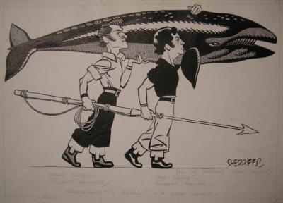 Robert Stewart “Bob” Sherriffs was born in Arbroath, Scotland, on 13 February 1906, the son of a flax merchant. Sherriffs showed an early interest in art, and was an arts medallist at Arbroath High School before going to Edinburgh College of Art in 1923. Influenced by Aubrey Beardsley and Alphonse Mucha, he later recalled that his three years at art school “confirmed my previous conviction that figures and faces were patterns to be studied and memorised - not patiently drawn from life.” Sherriffs also developed a life-long love of heraldic art. In January 1927 Sherriffs moved to London, and showed his portfolio around the commercial art and advertising studios. He also sent caricatures to illustrated magazines, and a drawing of John Barrymore was accepted by The Bystander. This led to a commission to illustrated a series of celebrity profiles for The Sketch, and these were so successful that from 1930 onwards Sherriffs was the magazine’s film and theatre caricaturist. In 1931 Sherriffs married Vera Anderson in London. From 1927 onwards Sherriffs also drew for the BBC’s Radio Times, and in 1935, after the death of Arthur Watts in an air crash, he took over as illustrator for the magazine’s prominent feature “Both Sides of the Microphone”.He also did work for Theatre World, Oxford and Cambridge, Nash’s Magazine, Pall Mall, Strand, and John O’London, and drew covers for Men Only. In 1933 Sherriffs also tried his hand at political cartooning, in the Sunday Referee, but it was not a success. After Will Dyson’s death, in January 1938, he applied to be political cartoonist on the Daily Herald, but was turned down. After the outbreak of war in 1939 Sherriffs joined the Tank Regiment, but later became a war artist, illustrating aircraft recognition handbooks. Demobilised in 1945, he found that the market for magazine illustration had profoundly changed, and he returned for a time to Scotland. However, in 1948 Sherriffs returned to London, where he married Emla Greenwood and in the same year succeeded J.H. Dowd as film caricaturist for Punch. Soon afterwards Sherriffs also returned to regular work for the Radio Times. Influenced by Edmund Dulac, with whom he worked for a time, Sherriffs also illustrated a number of books, beginning in 1930 with Christopher Marlowe’s The Life and Death of Tamburlaine the Great. He also wrote the comic novel Salute if You Must (1944). A tall, lean figure, with striking violet-blue eyes, and often wearing a characteristic knotted scarf, Sheriffs’s most famous film caricatures were produced from studio stills or drawn after brief visits to preview screenings, where he seldom remained for the whole film. He preferred to draw with a brush rather than a pen, and, contemptuous of deadlines and averse to working in London, he dispatched his finished work by train. “Sherriffs was sophisticated, literate, but wrapped always in a cloak of shyness”, noted Nicholas Bromley, and throughout his career he “successfully guarded his privacy from both his public and his contemporaries.” Diagnosed with cancer in 1959, Sherriffs burned all his personal papers before he was admitted to hospital. He died on 26 December 1960.